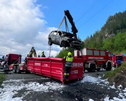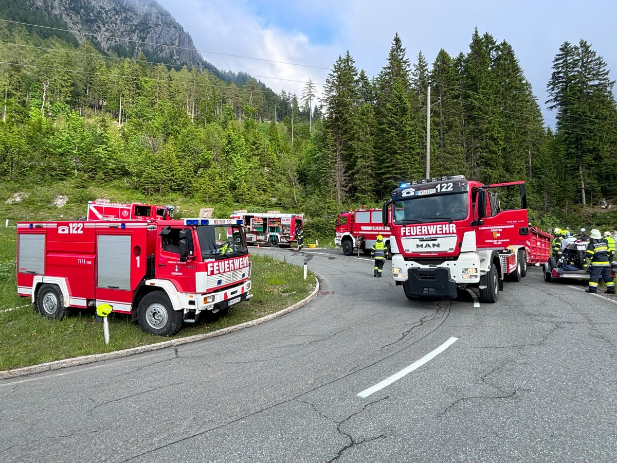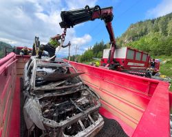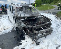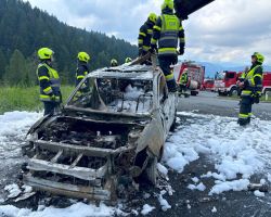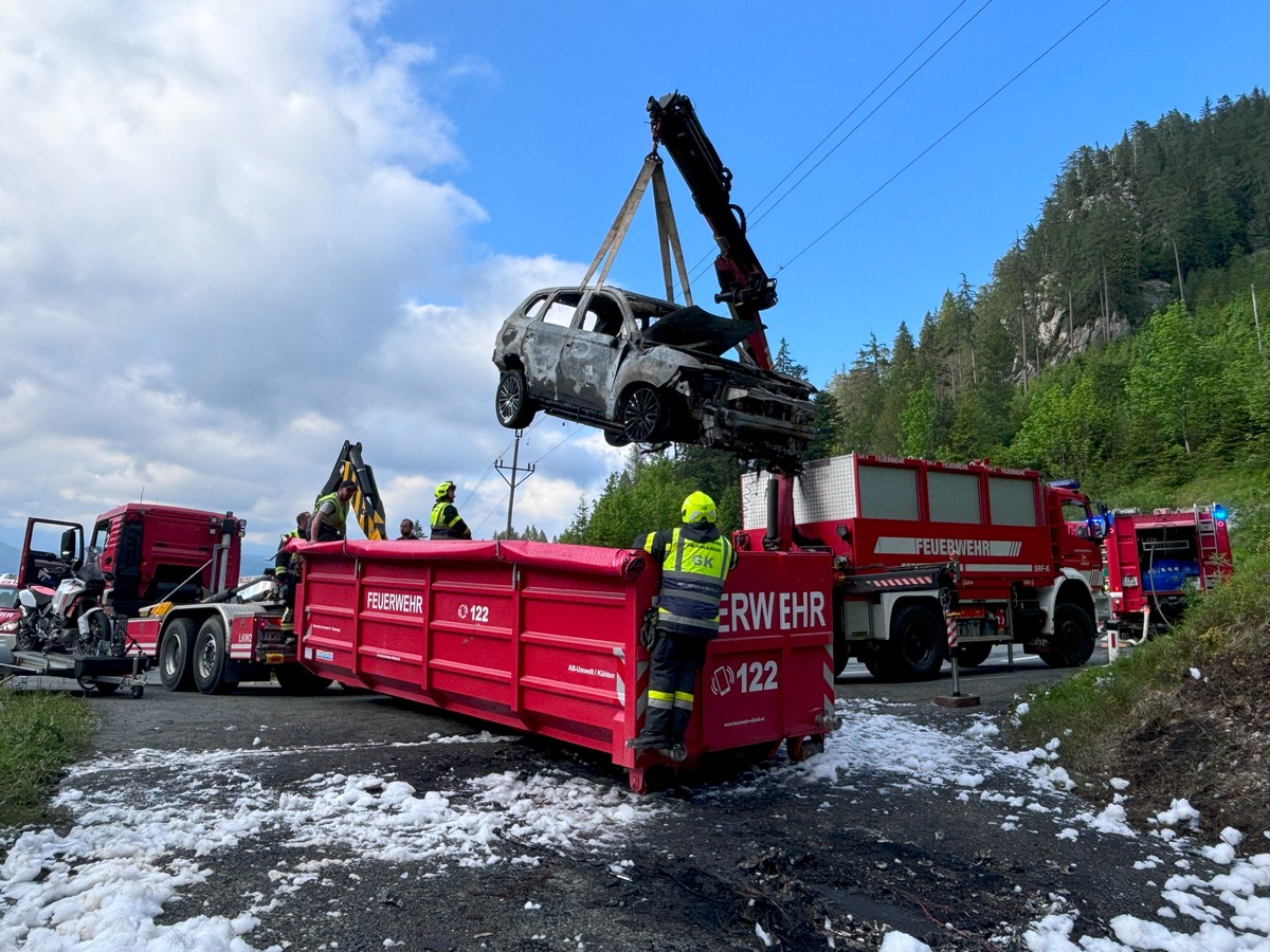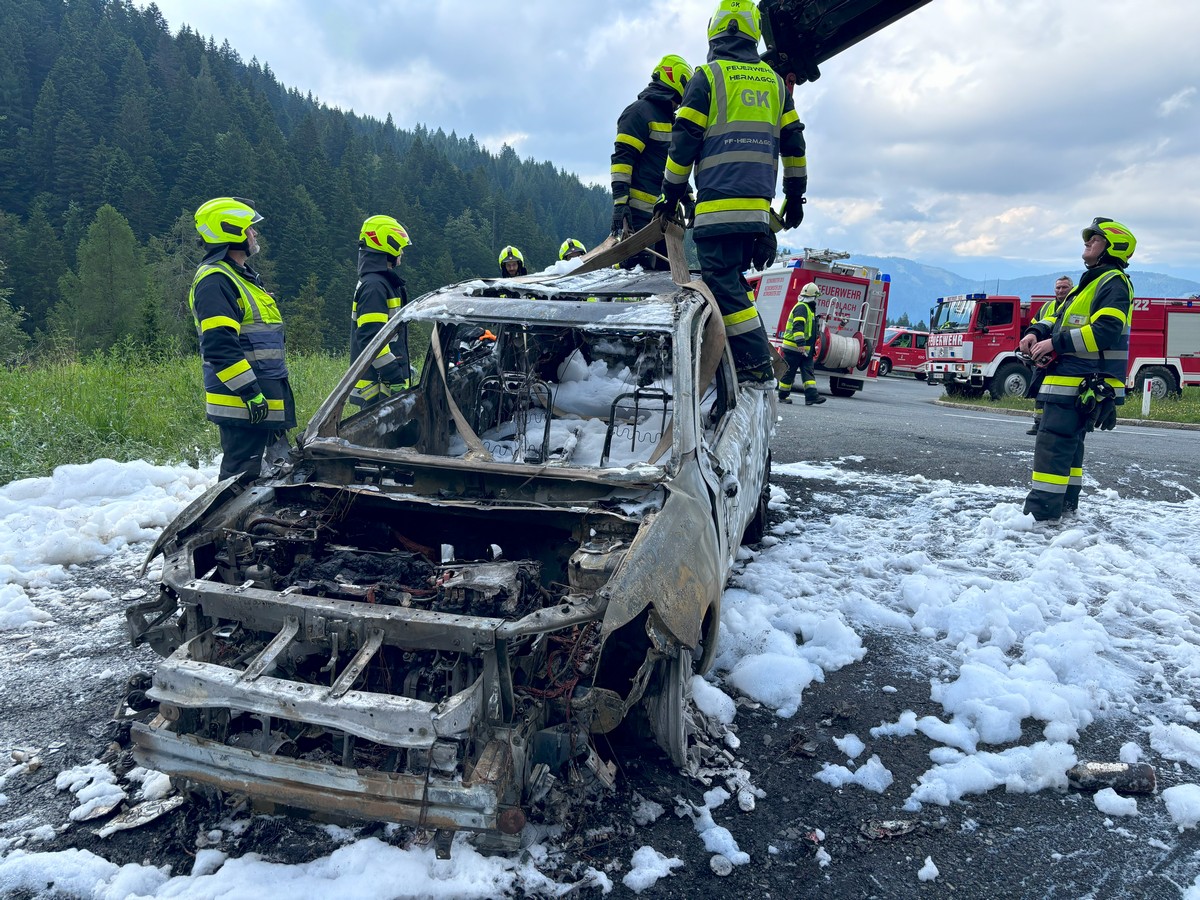 Zu einem Fahrzeugbrand eines Hybrid-Pkw wurden die Feuerwehren Tröpolach, Rattendorf und Hermagor am 14. Juni auf die Nassfeldbundesstraße alarmiert.