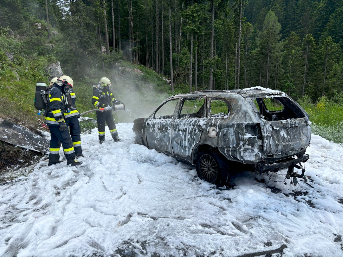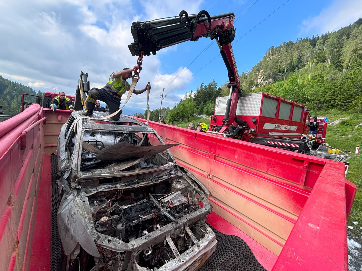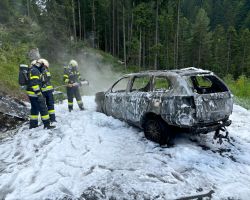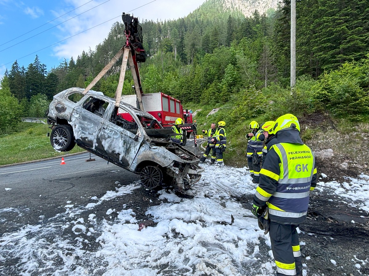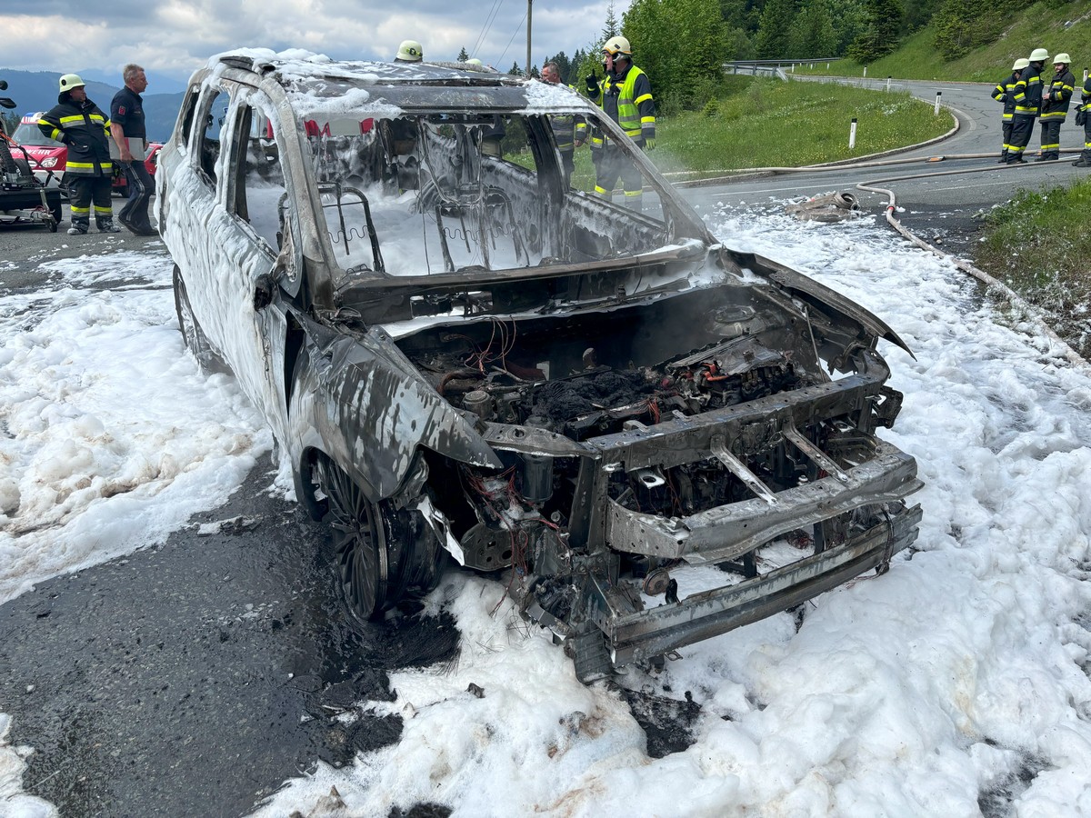 Ein Hybrid-Fahrzeug ging aus unbekannter Ursache auf der Nassfeldbundesstraße in Flammen auf. Die Fahrzeuginsassen konnten sich rechtzeitig in Sicherheit bringen, bevor das Hybrid angetriebene Fahrzeug ausbrannte.