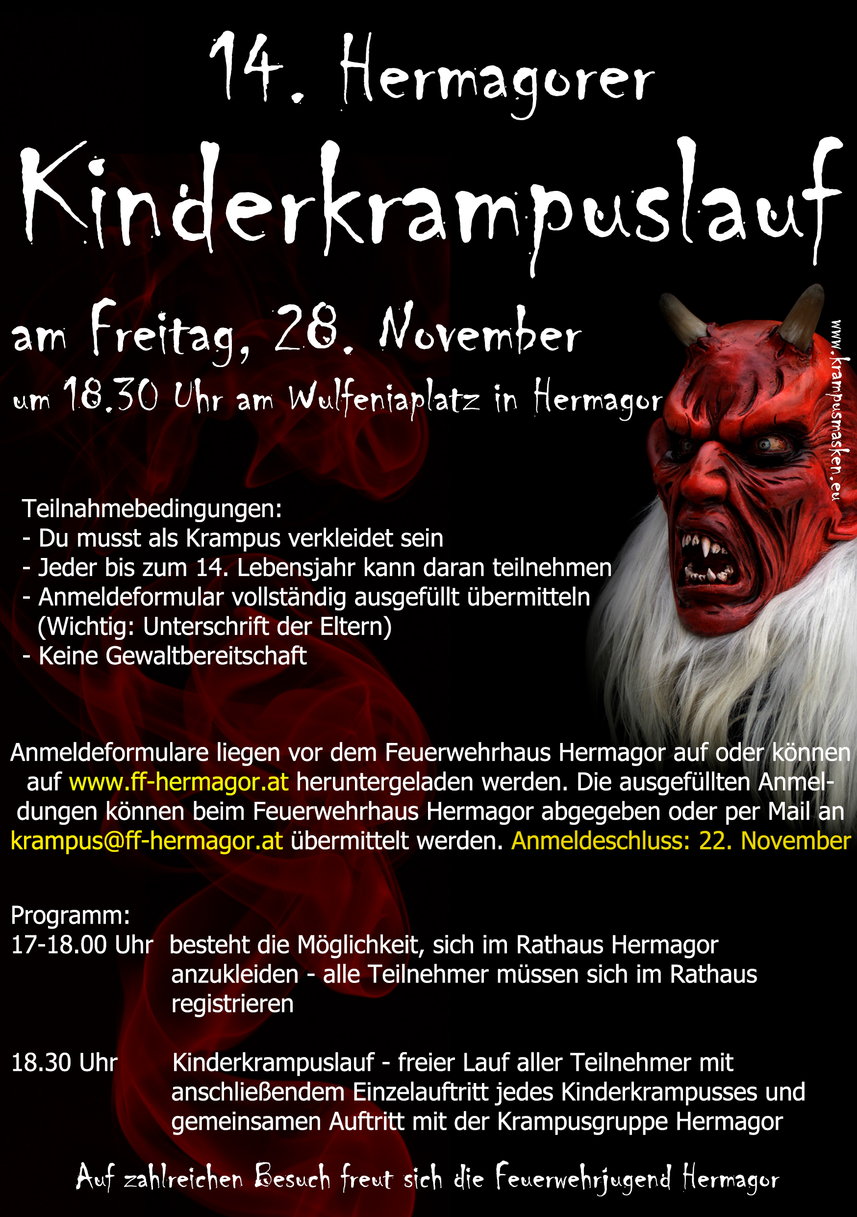 Am Freitag, dem 28. November 2025 verwandelt sich Hermagor wieder in einen „schaurigen“ Showroom für die Kinderkrampusse der Region. Bereits zum 14. Mal lädt die Feuerwehrjugend der FF Hermagor recht herzlich zum Kinderkrampuslauf ein.